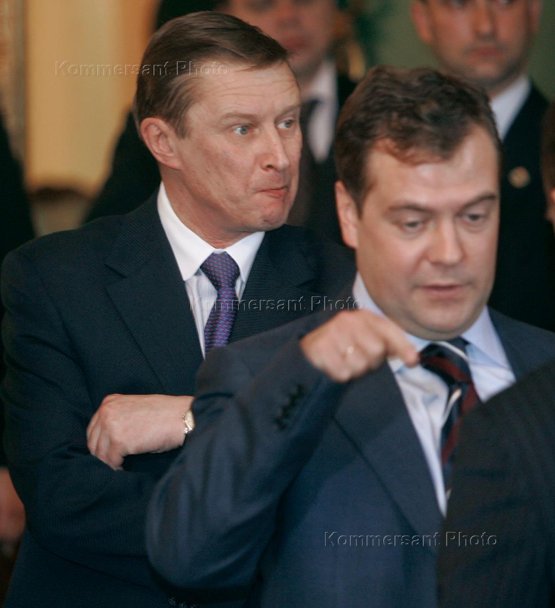 Министр обороны России Сергей Иванов (слева) и руководитель администрации Президента России Дмитрий Медведев (справа) во время саммита в Братиславе.