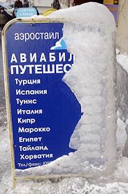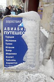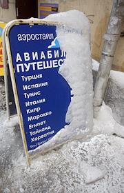 Заснеженный рекламный стенд бюро путешествий и продажи авиабилетов на Проспекте Мира.