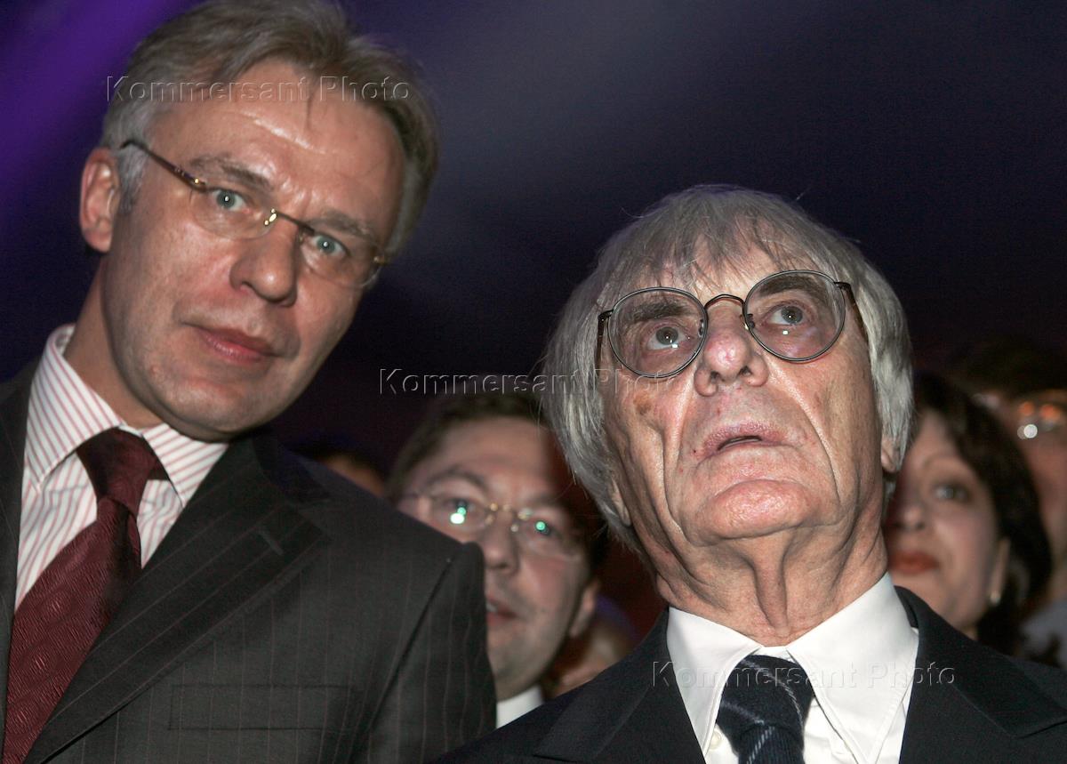 Руководитель Федерального агентства по физической культуре, спорту и туризму Вячеслав Фетисов (слева) и обладатель коммерческих прав на гонки "Формулы-1" Берни Экклстоун (справа) на презентации русской команды Формулы-1 на Васильевском спуске.