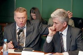 Заместитель председателя Государственной Думы России, лидер Либерально-демократической партии России (ЛДПР) Владимир Жириновский (слева) и директор Центра политологических программ "Горбачев-Фонда" Виктор Кувалдин (справа) на международной конференции "Власть и свобода: 20 - летие демократического эксперимента в СССР и России". Конференция прошла в "Президент-Отеле".