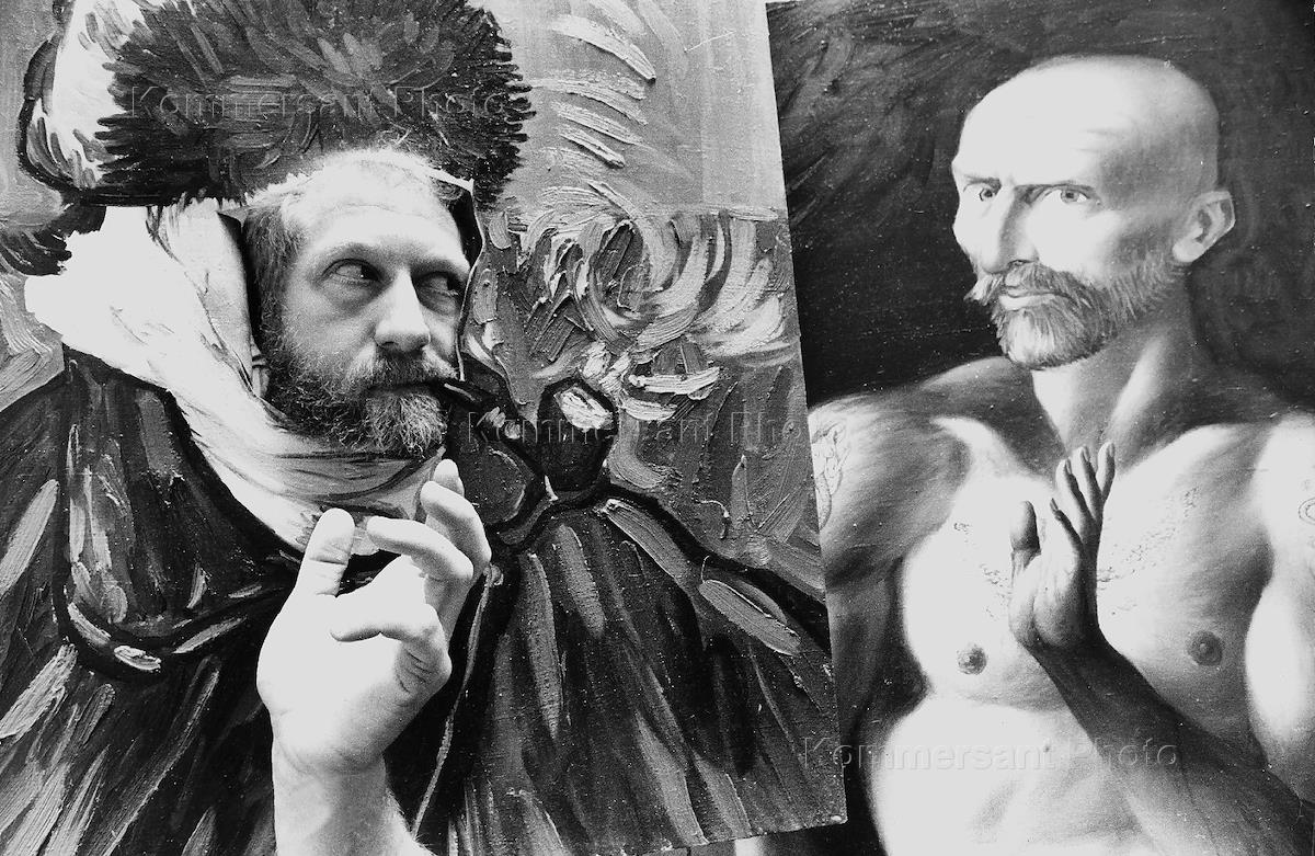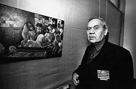 Художник Алексей Воробьев среди картин на выставке своих работ в Малом Манеже.