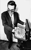Глава компьютерной фирмы "Pick Systems" Ричард Пик демонстрирует новинки своего производства на пресс-конференции.