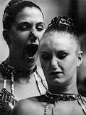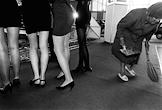 жанровая фотография. Участницы конкурса красоты и женщина уборщица (справа) собирает мусор после мероприятия.