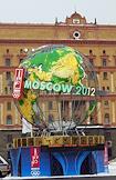 Олимпийская символика в городе. Накануне визита в Москву оценочной комиссии Международного олимпийского комитета идет подготовка столичных улиц к их встрече. Объемно-декоративная конструкция в виде земного шара с электронным панно, семь метров в диаметре, была установлена на Лубянской площади.