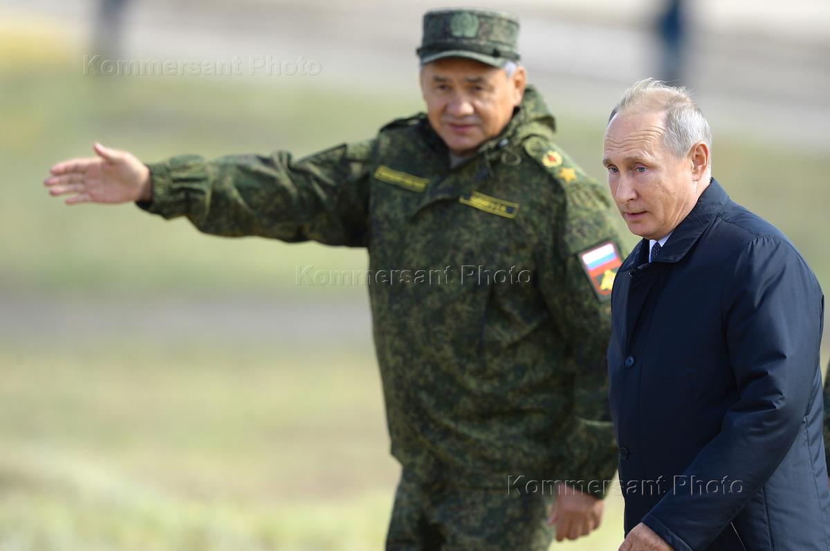Military exercises "East 2018" at the site Tsugol. The parade of motorized and aviation equipment, participating in the military maneuvers of the Russian and Chinese armed forces. Russian Defense Minister Sergei Shoigu (right) and Russian President Vladimir Putin (left) during the parade.