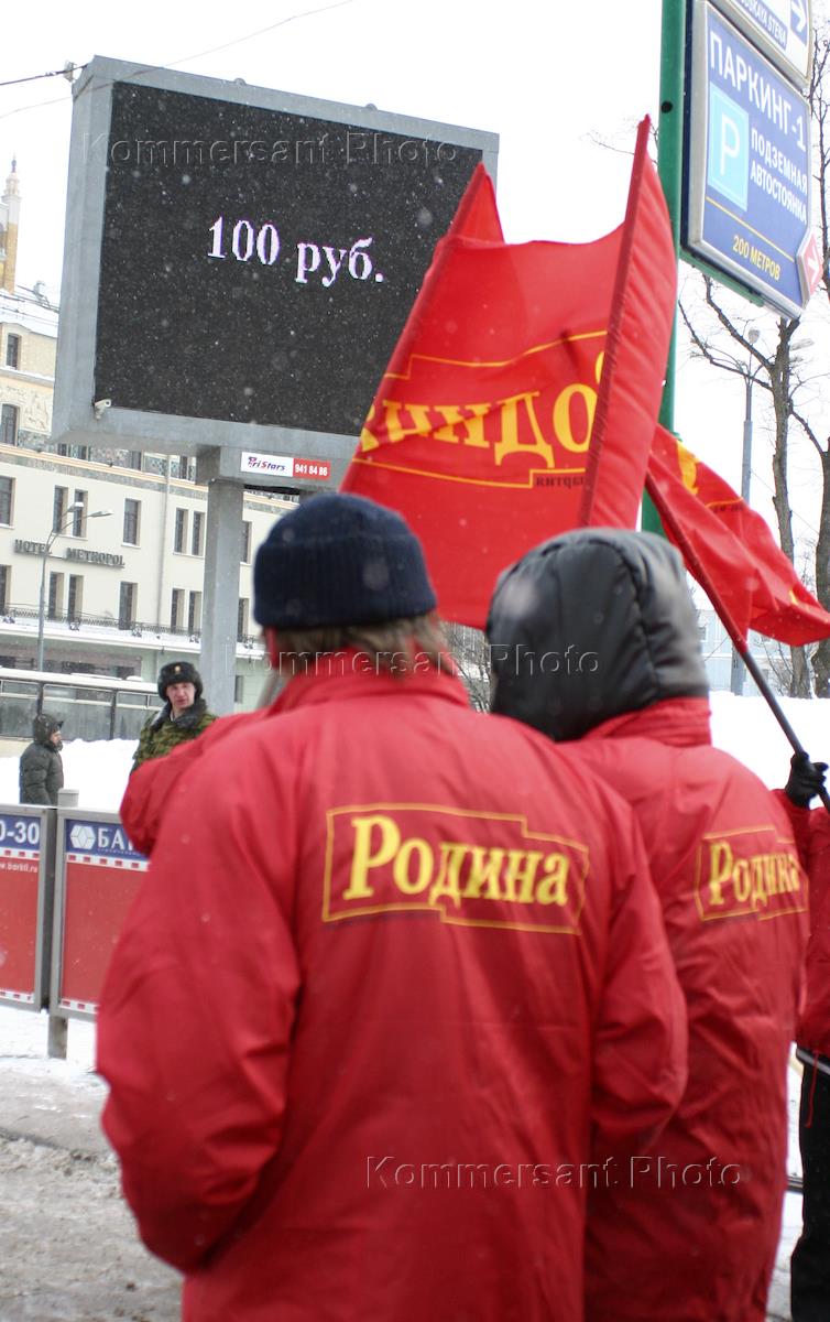 A rally staged by the Russian populist centre-left party Rodina ('Motherland') in downtown Moscow.