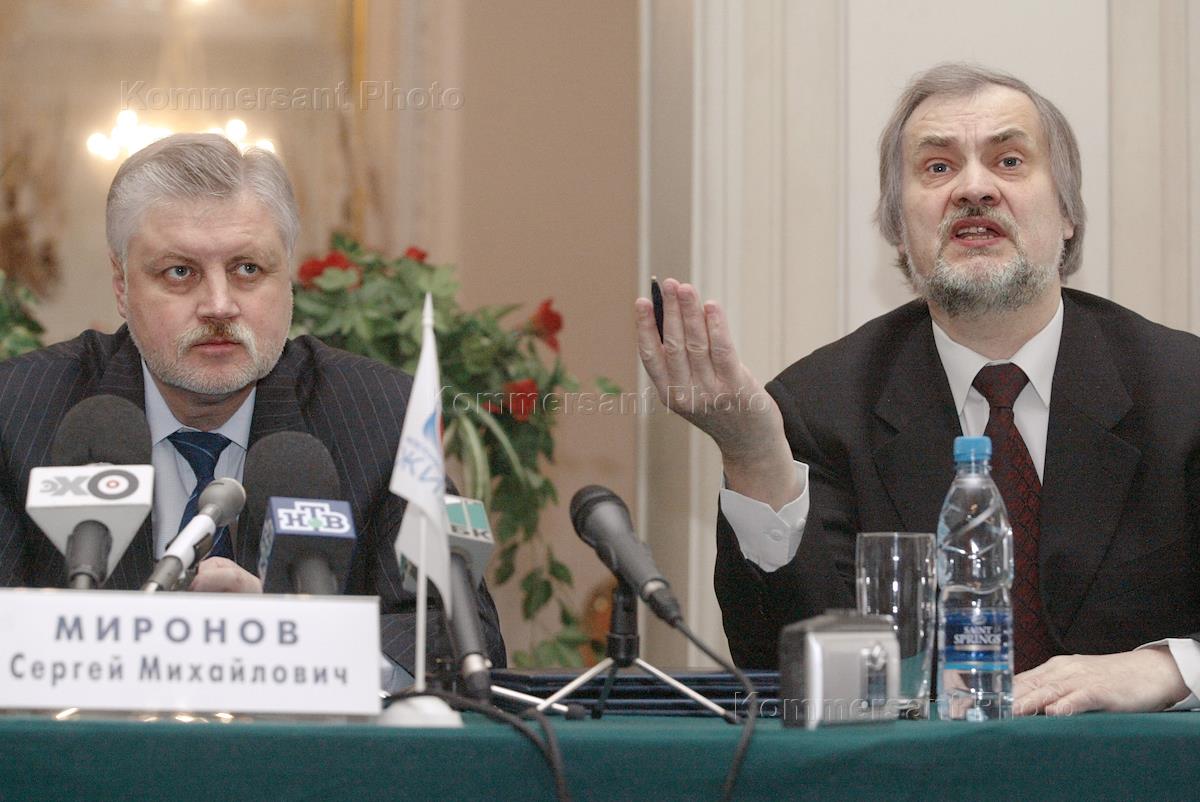 Speaker of the Federation Council, leader of the Russian Life Party Sergey Mironov (left) and leader of the SLON ('Elephant') party Vyacheslav Igrunov (right) take part in the meeting summoned to sign co-operation and partnership agreement. The event was held in the Central Scientists House.