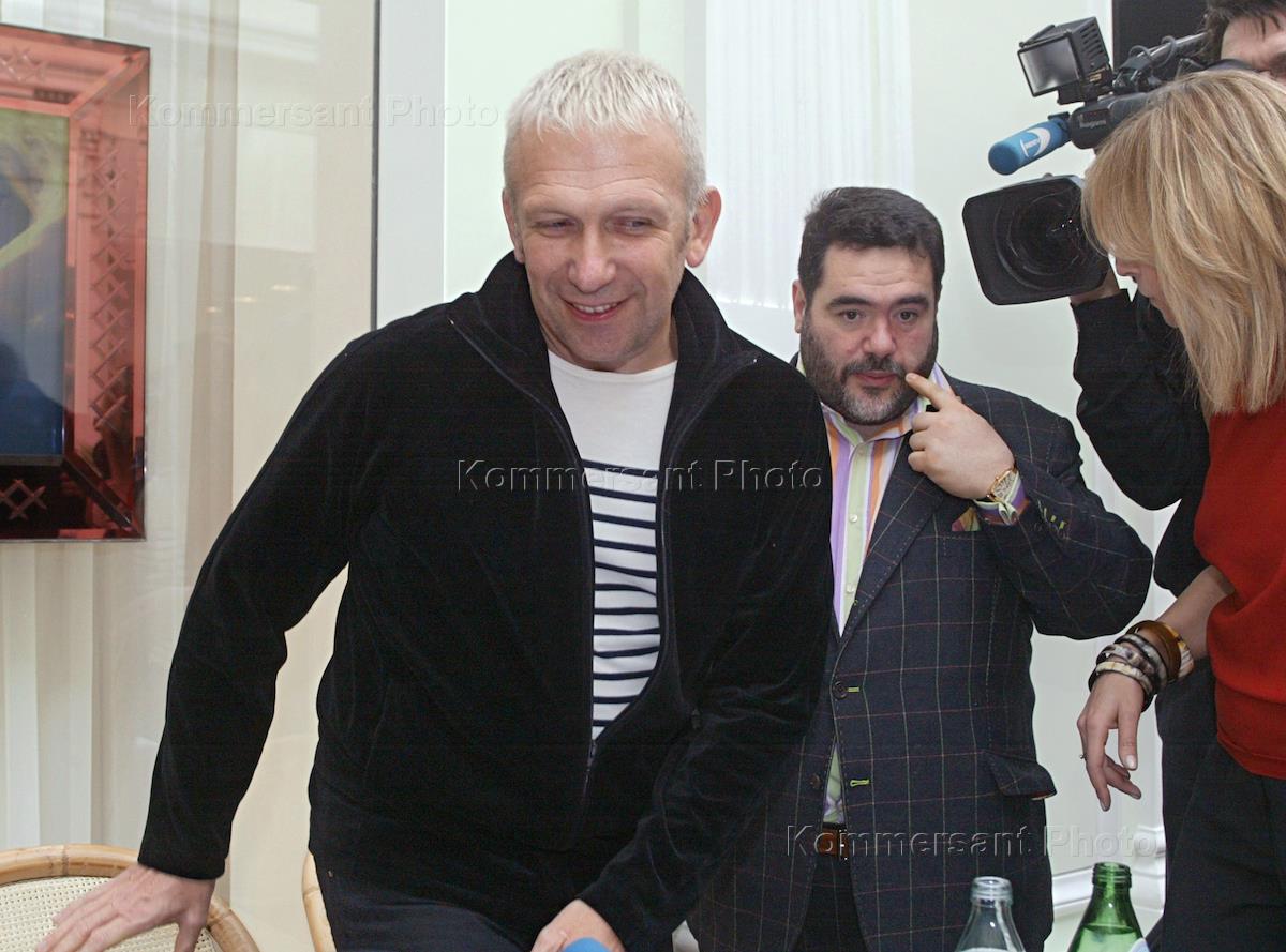 French fashion designer Jean-Paul Gaultier (right) is interviewed during the opening ceremony of his boutique in Moscow.
