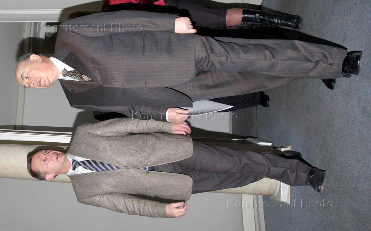 Первый заместитель мэра Москвы, руководитель комплекса архитектуры, строительства, развития и реконструкции Москвы Владимир Ресин (справа) перед началом пресс-конференции на тему: "Московский строй-комплекс: строим больше, лучше, выше. Планы на 2005 год". Пресс-конференция прошла в пресс-центре "Аргументы и Факты".