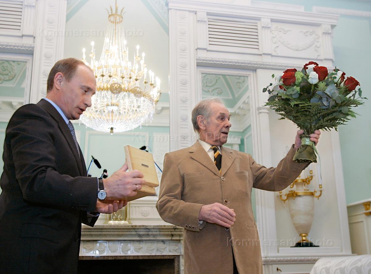Russian President Vladimir Putin (left) met famous actor Georgy Zhzhenov (not seen), who turned 90.