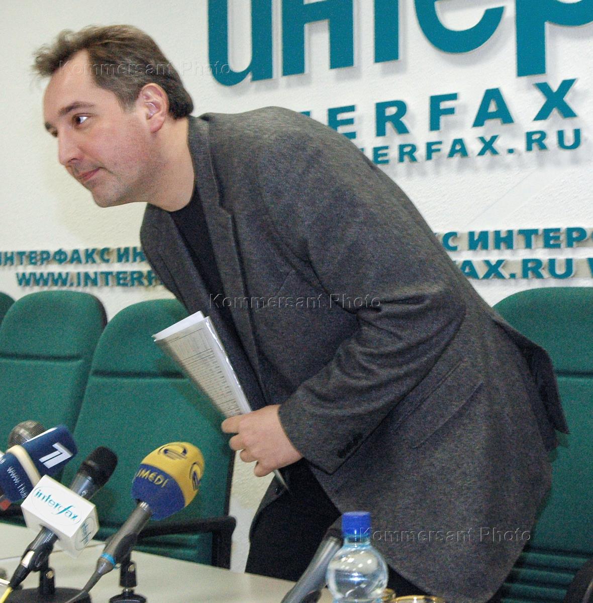 Leader of the Russian populist centre-left party Rodina ('Motherland') Dmitry Rogozin is interviewed during a news conference headlined 'The political results and lessons of the elections in the Voronezh and Ryazan regions'. The press conference was held in the Interfax news agency.