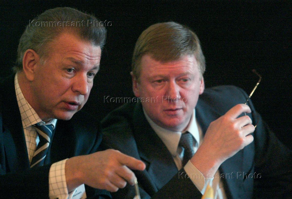 Russian United Energy Systems (RAO UES Russia) CEO Anatoly Chubays, right, and vice CEO Vyacheslav Voronin, left, take part in a meeting devoted to conception of technical policy and potential of foreign producers in it's implementation. The event took place in All-Russia thermal engineering institute.