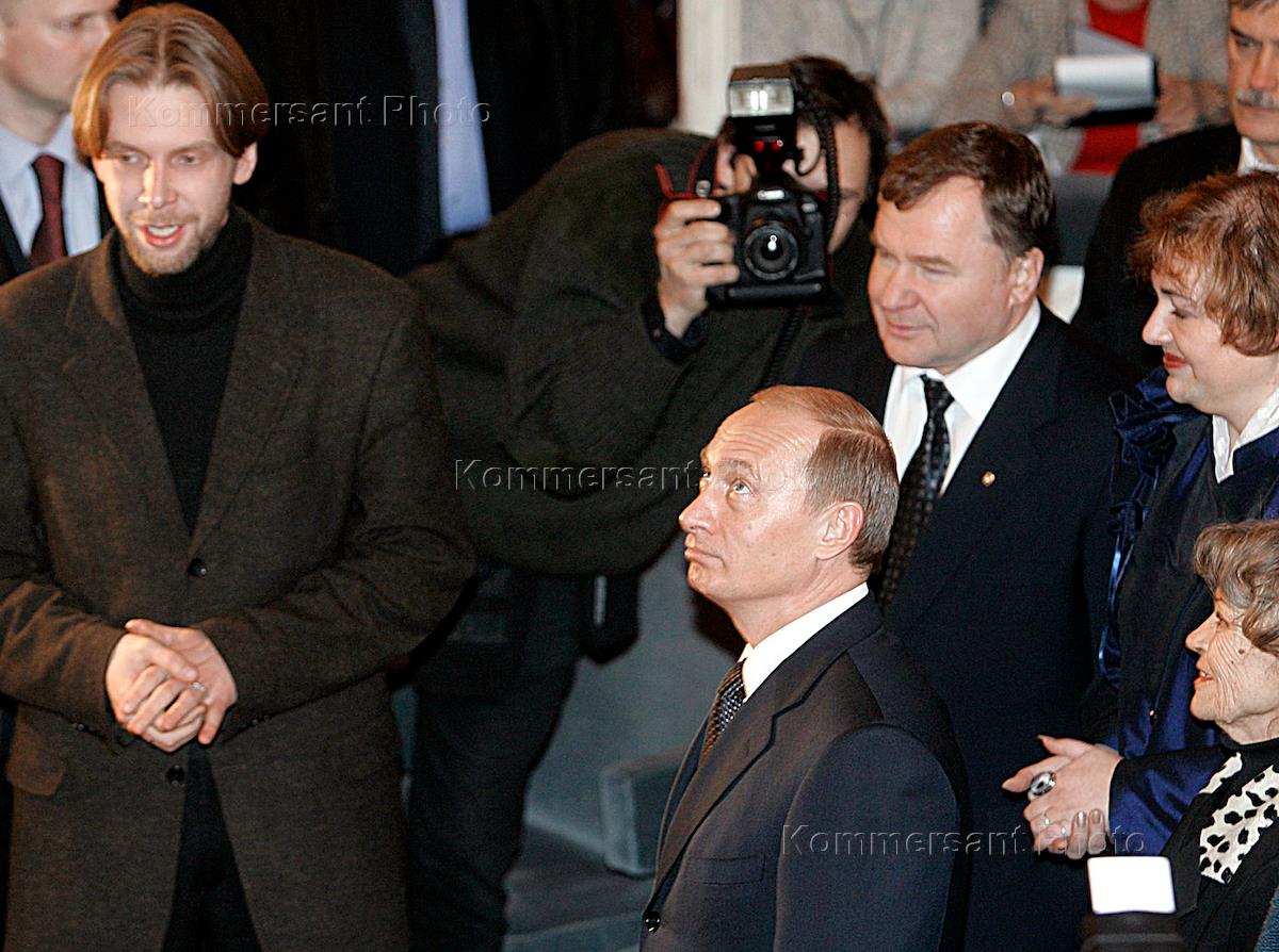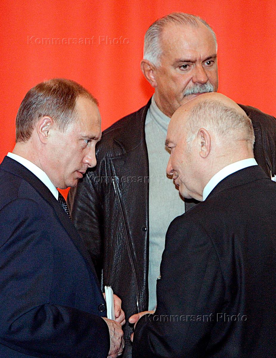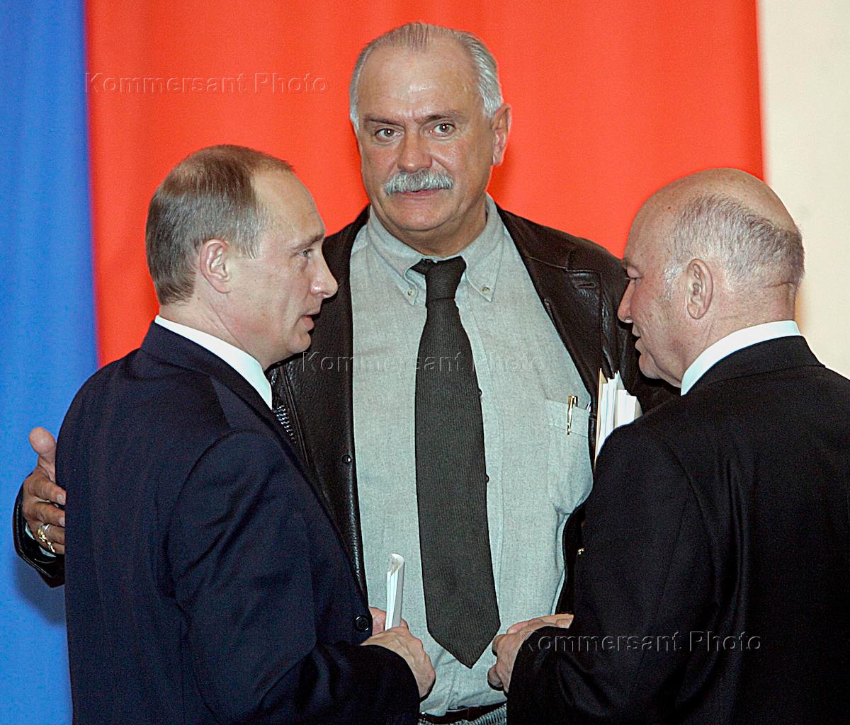 Президент России Владимира Путина (слева), председатель союза кинематографистов России, кинорежиссер Никита Михалков (в центре) и мэр Москвы Юрий Лужков (справа) во время выездного совместного заседания президиума Госсовета и президиума Совета по культуре и искусству.