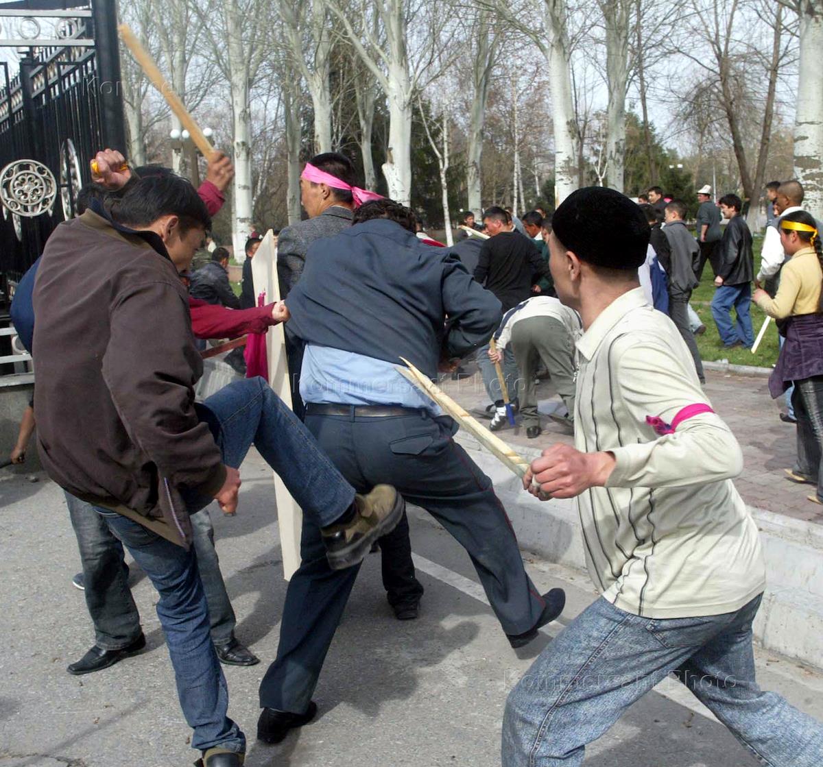Политическая ситуация в Киргизии. Массовые антиправительственные выступления сторонников оппозиции. Мужчины избивают полицейского дубинками.