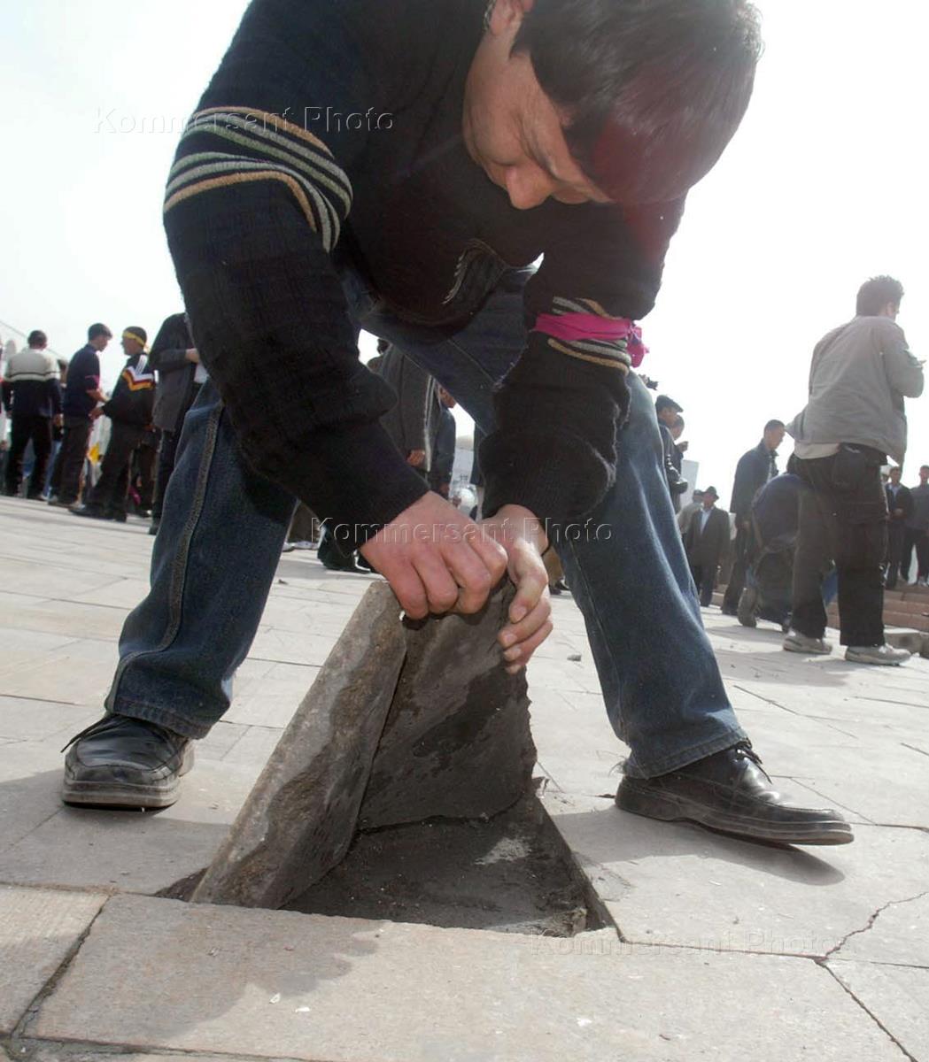 Политическая ситуация в Киргизии. Массовые антиправительственные выступления сторонников оппозиции. Молодой мужчина вынимает камень из мостовой.