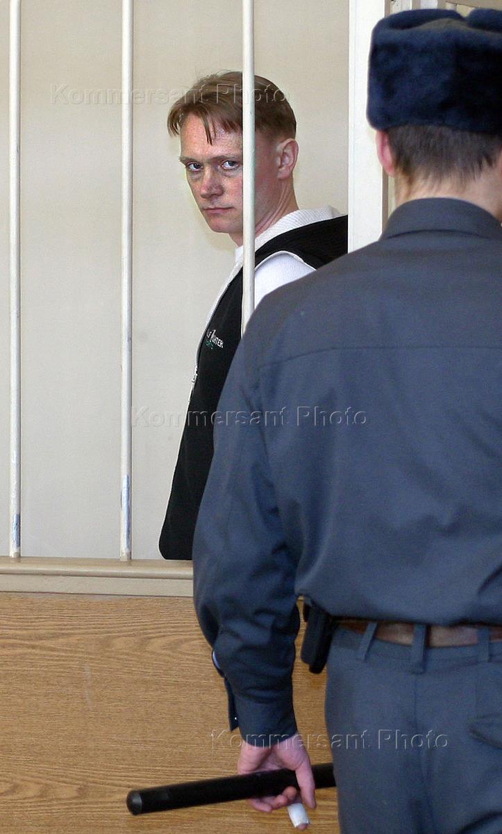 Former broker of the Tovarnaya Birzha 'St.Petersburg' Dmitry Vladimirov appears during the trial in the city court. Dmitry Vladimirov was convicted of murder of the Depositary Director Boris Pustynnikov and theft of securities and $3 million from the vault.
