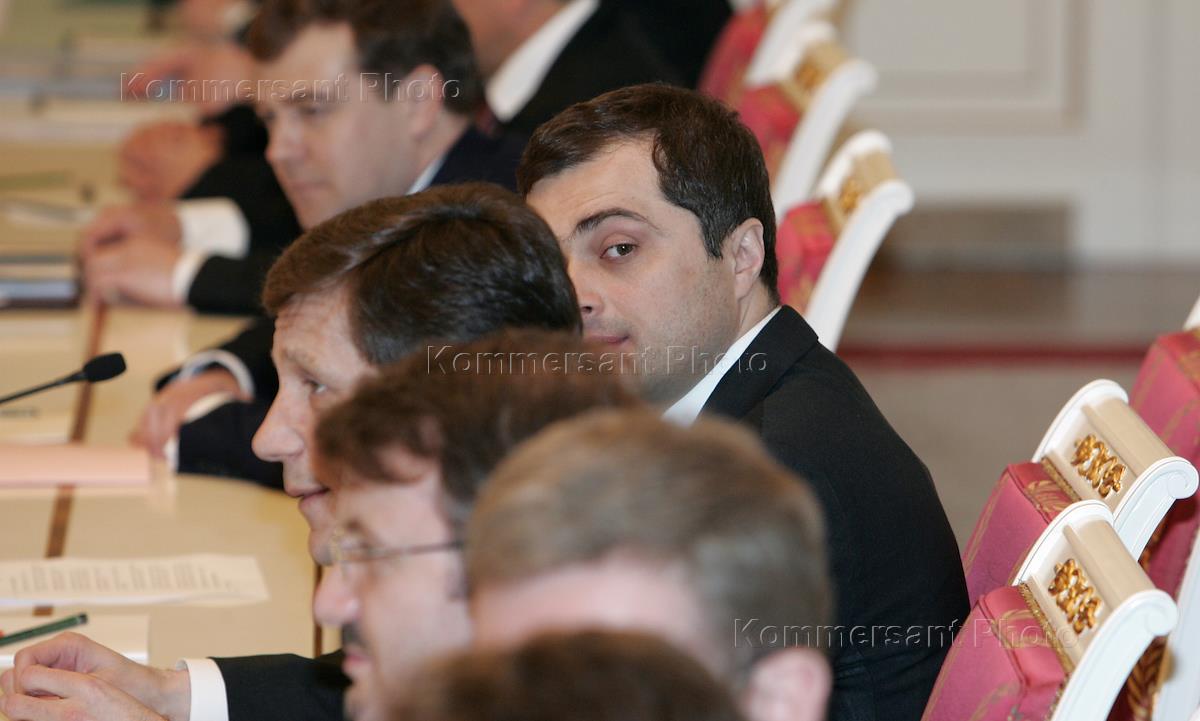 Заместитель главы администрации Президента России Владислав Сурков (в центре) на встрече Президента России Владимира Путина с представителями бизнес-сообщества. Встреча состоялась в Кремле.