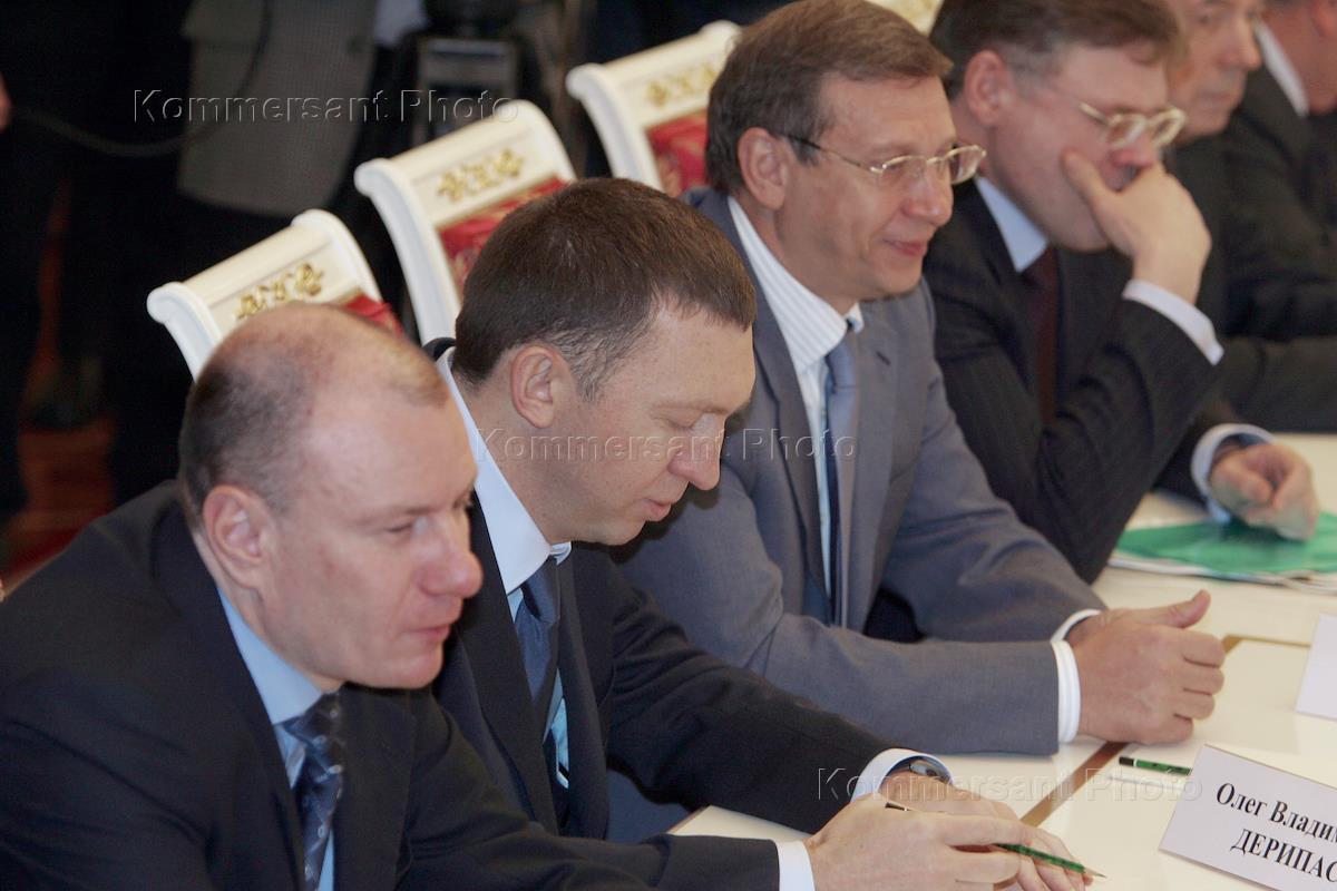 President of the group of companies "Siberian Aluminium" Oleg Deripaska (centre), President of Interros holding Vladimir Potanin (left) and Chairman of the AFK Sistema company directors board Vladimir Yevtushenkov (the second to the right) take part in the meeting of Russian President Vladimir Putin and Russian businessmen. The meeting took place in the Kremlin.