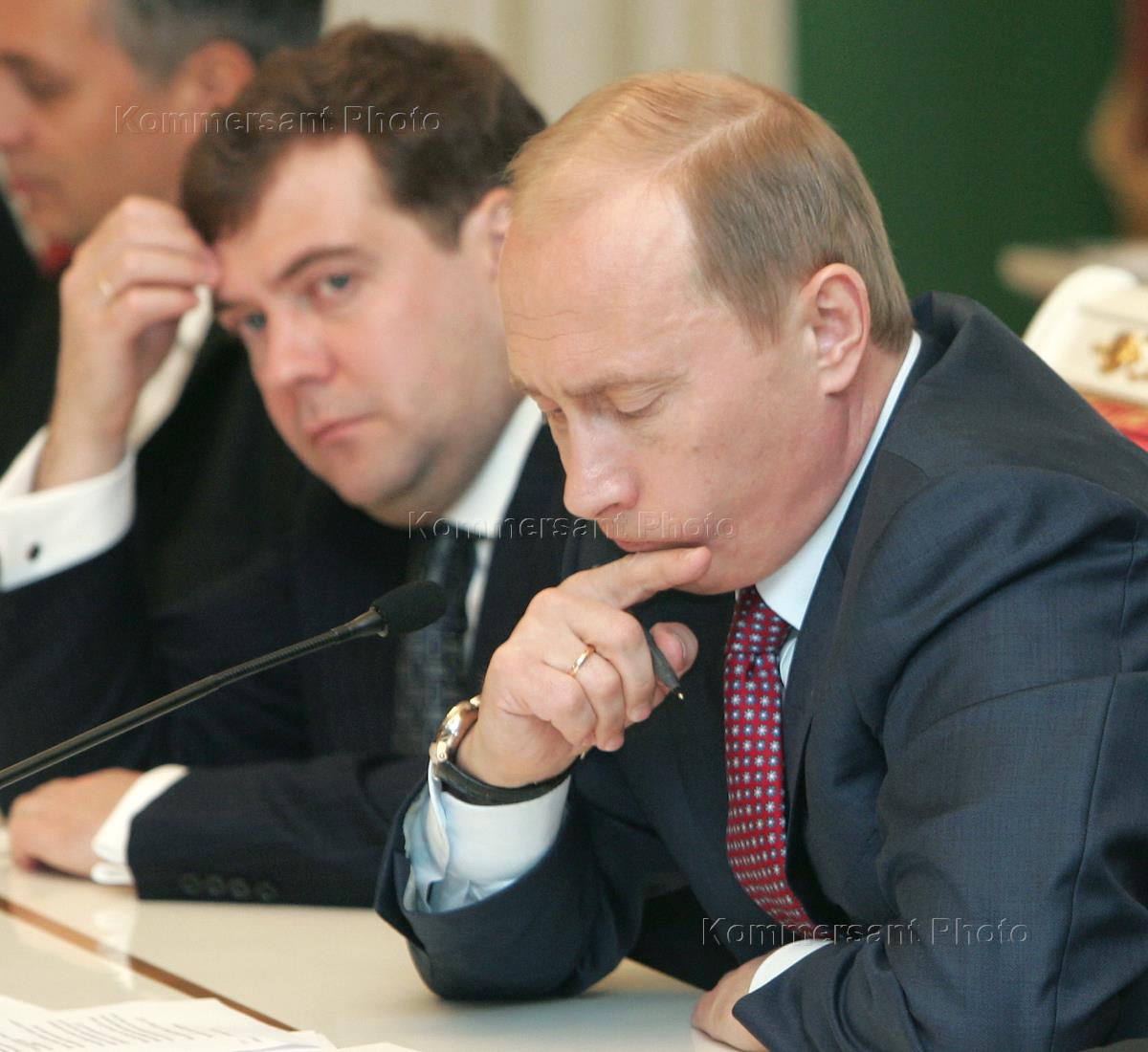 Head of the presidential administration Dmitry Medvedev (left) and Deputy chief of the presidential staff Vladislav Surkov (right) take part in the meeting of Russian President Vladimir Putin (centre) and Russian businessmen. The meeting took place in the Kremlin.