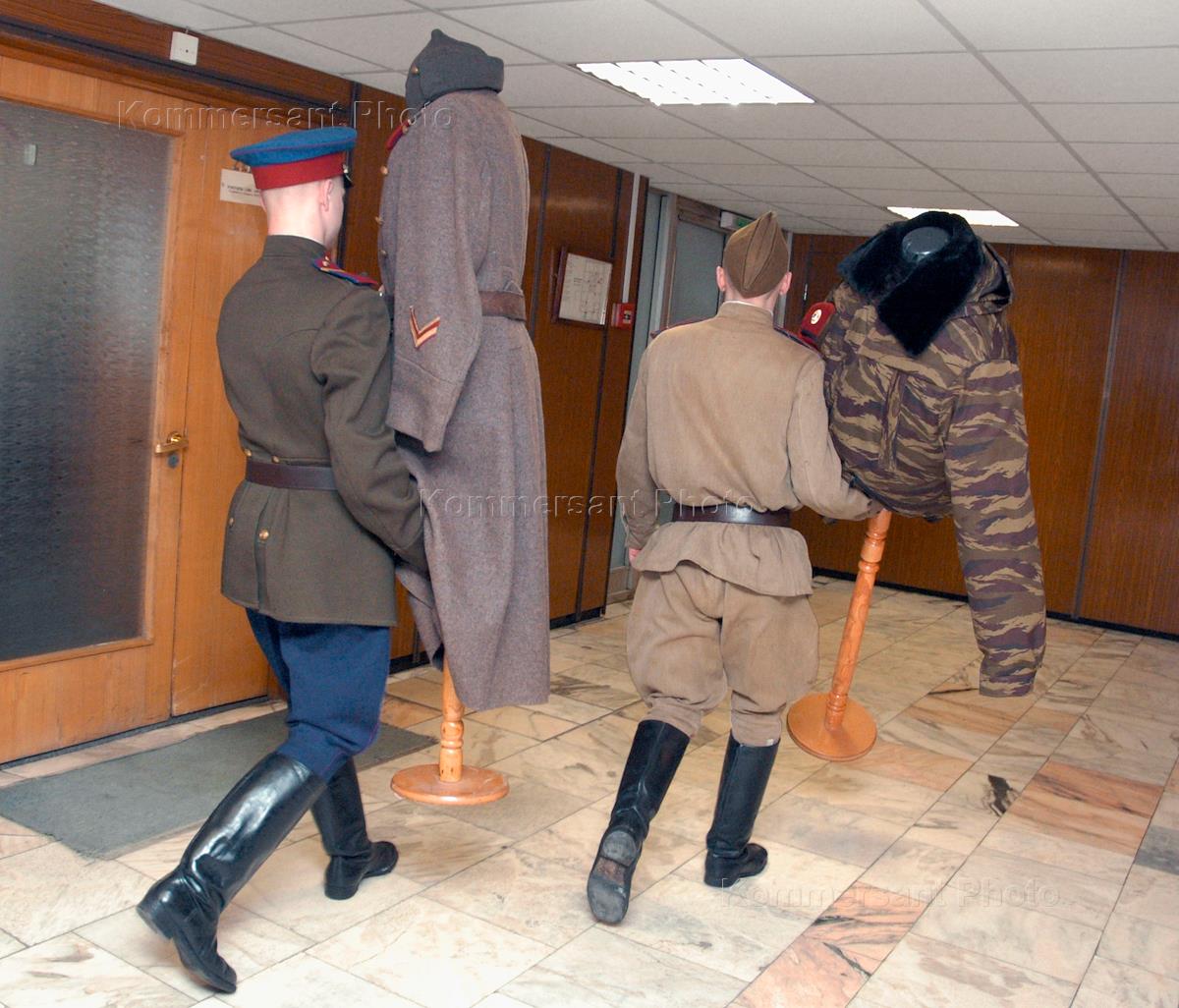 The Russian Interior Ministry forces soldiers carry mannequins into the ITAR-TASS building prior to the interview of the commander of the Russian Interior Ministry forces.