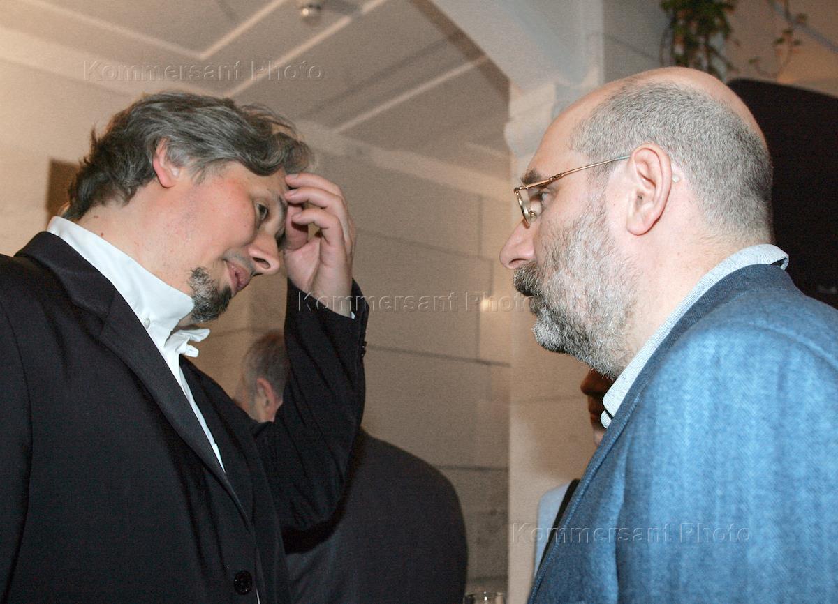 Writers Vladimir Sorokin (left) and Boris Akunin (right) take part in a party held in the Bolshoi Theater to celebrate the premiere of the "Rosental's Children" opera.