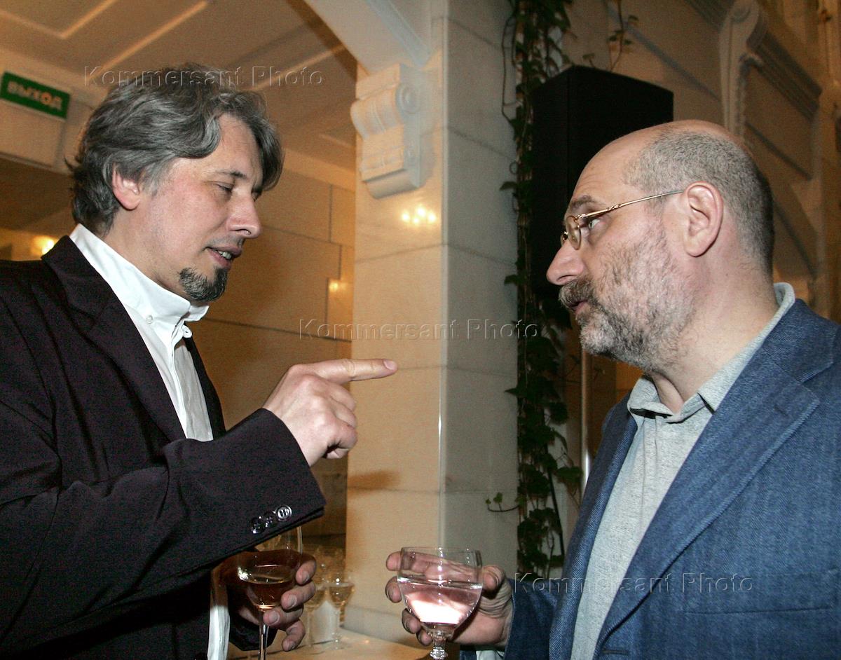 Writers Vladimir Sorokin (left) and Boris Akunin (right) take part in a party held in the Bolshoi Theater to celebrate the premiere of the "Rosental's Children" opera.