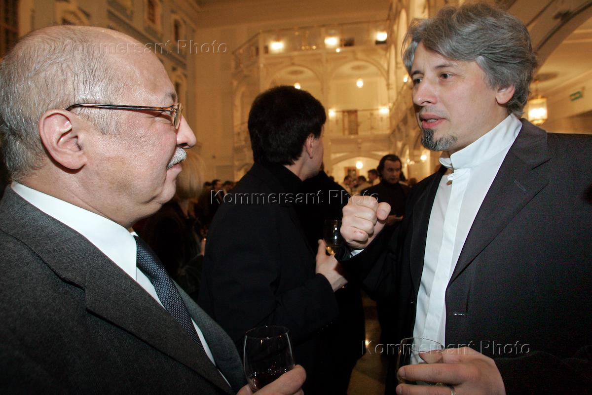 General director of State Academic Bolshoi Theatre (GABT) Anatoly Iksanov (left) and the Bolshoi Theatre music conductor Alexander Vedernikov (right) take part in a party held in the Bolshoi Theater to celebrate the premiere of the "Rosental's Children" opera.