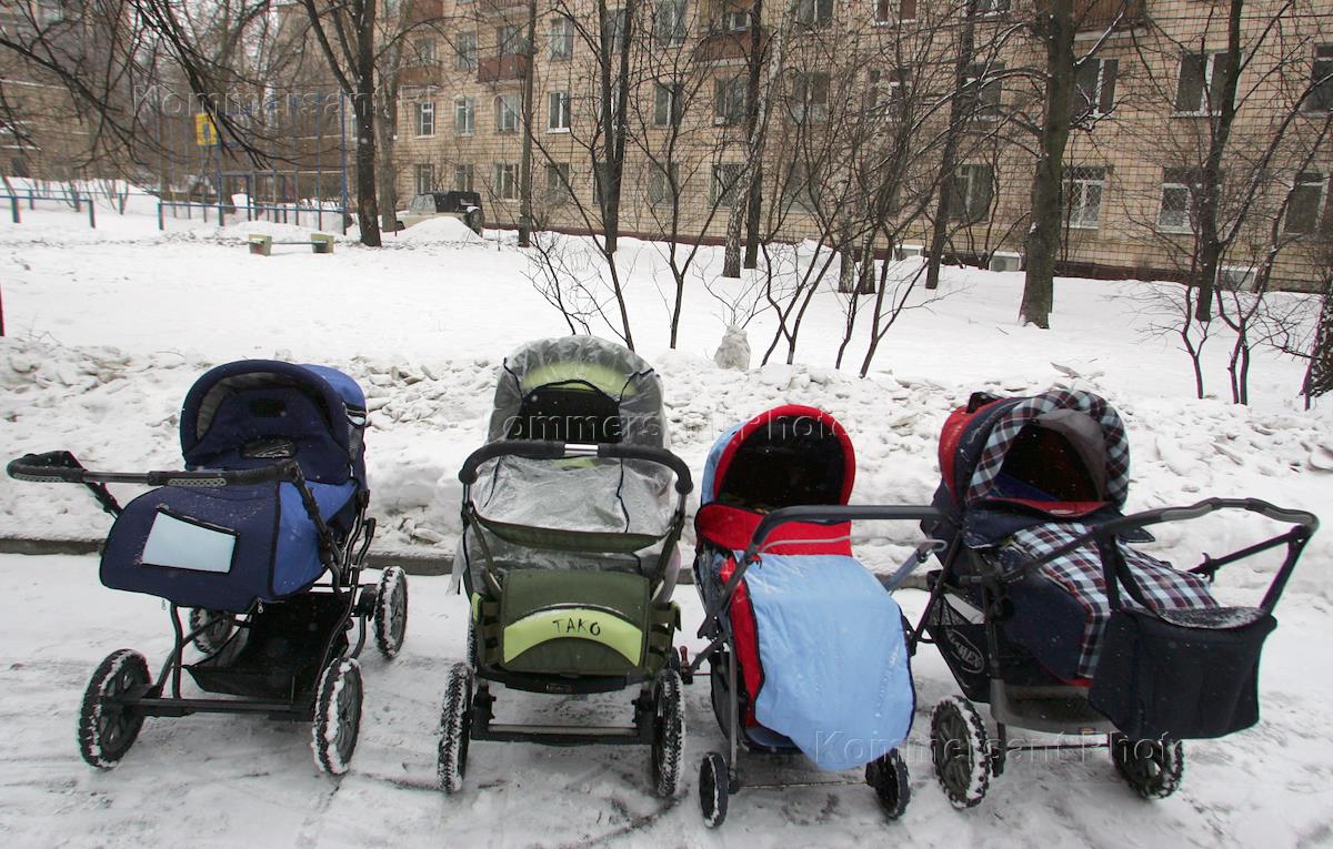 Several baby carriages stand in the yard in front of a living house.