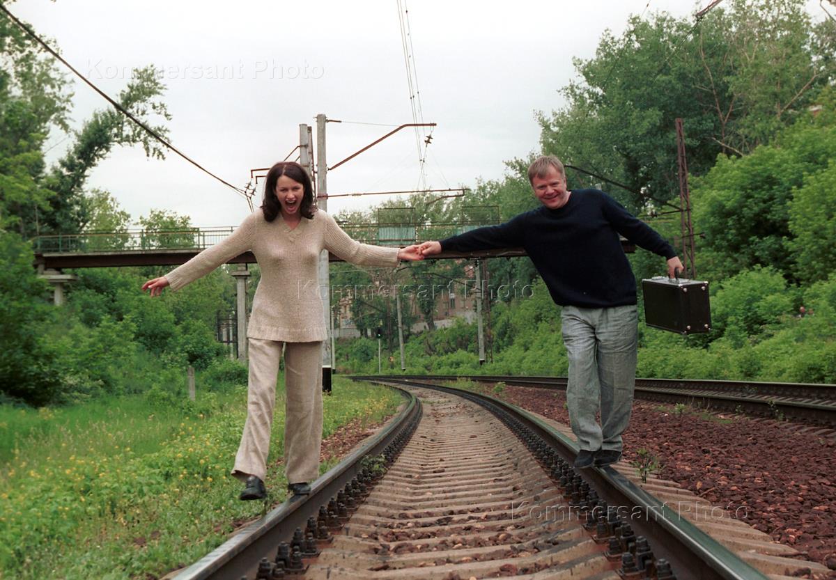 Actors Mikhail Efremov (left) and Evgenia Dobrovolskaya (right) during the filming of The Afternoon Pan film.