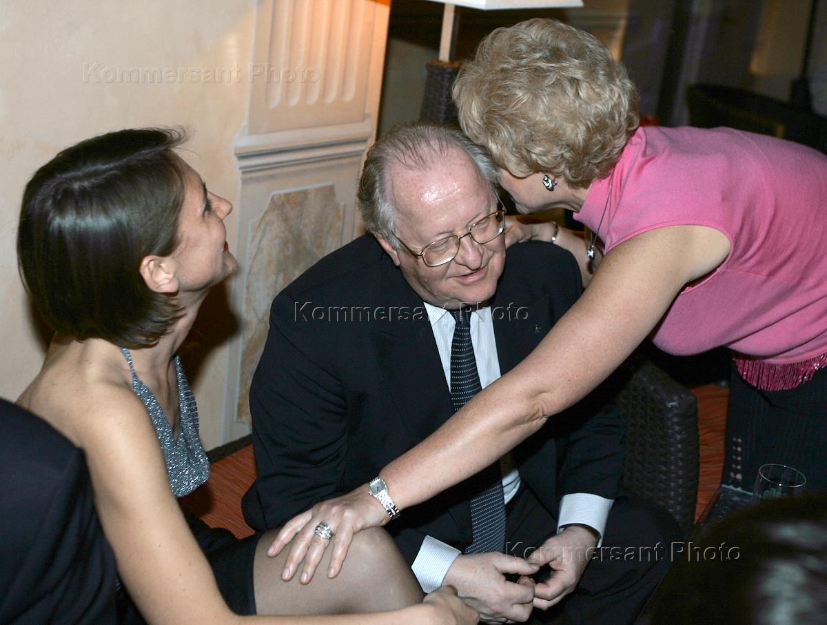 Председатель совета директоров НК "ЮКОС", депутат Государственной Думы России Виктор Геращенко (в центре) и Представитель в Совете Федерации (СФ) России от Великого Хурала Республики Тыва Людмила Нарусова (справа) во время ужина "Chivas Party" для участников XI международной бизнес-конференции, организованной агентством "Росбизнесконсалтинг" (РБК), в Гштааде.