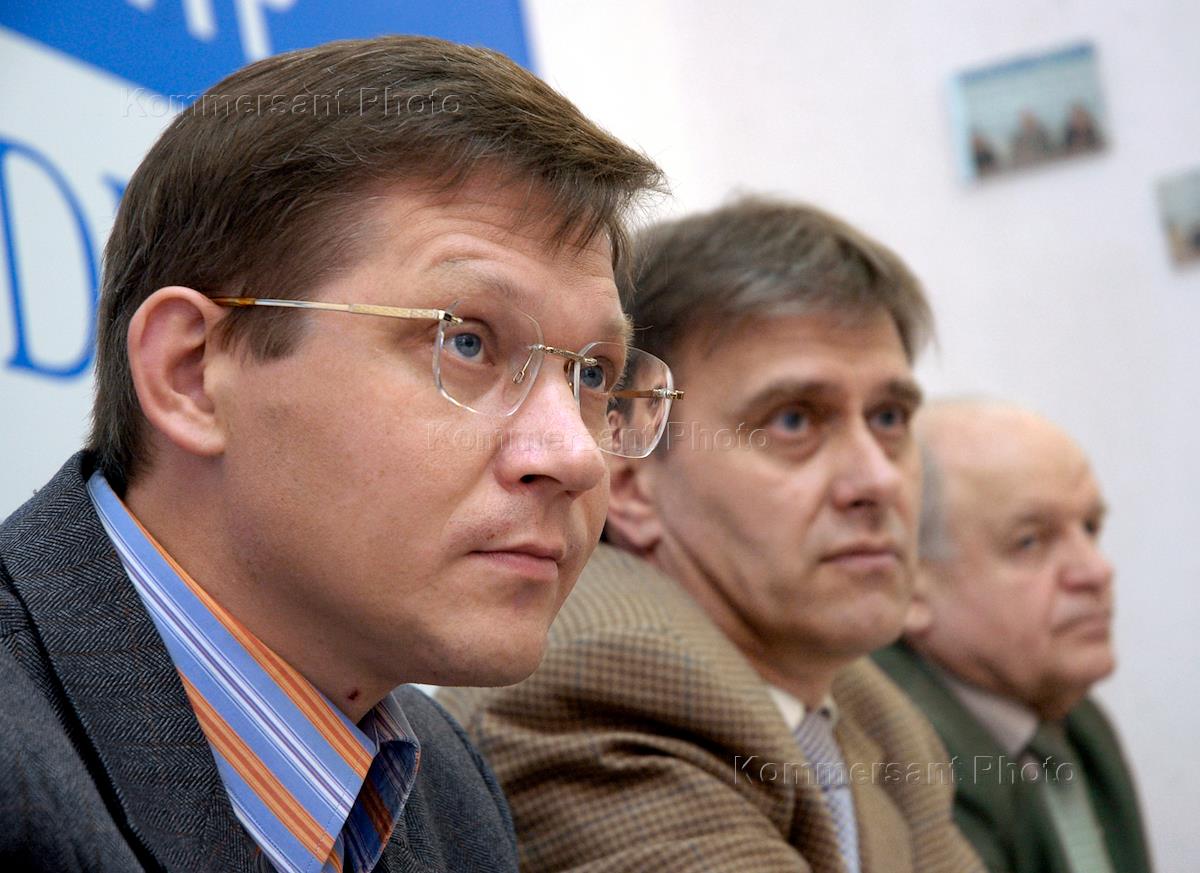 Russian State Duma lawmaker, member of the federation issues and regional policies committee Vladimir Ryzhkov (left) and Deputy of the State Duma of Russia Victor Cherepkov (the second to the right) take part in a press conference.