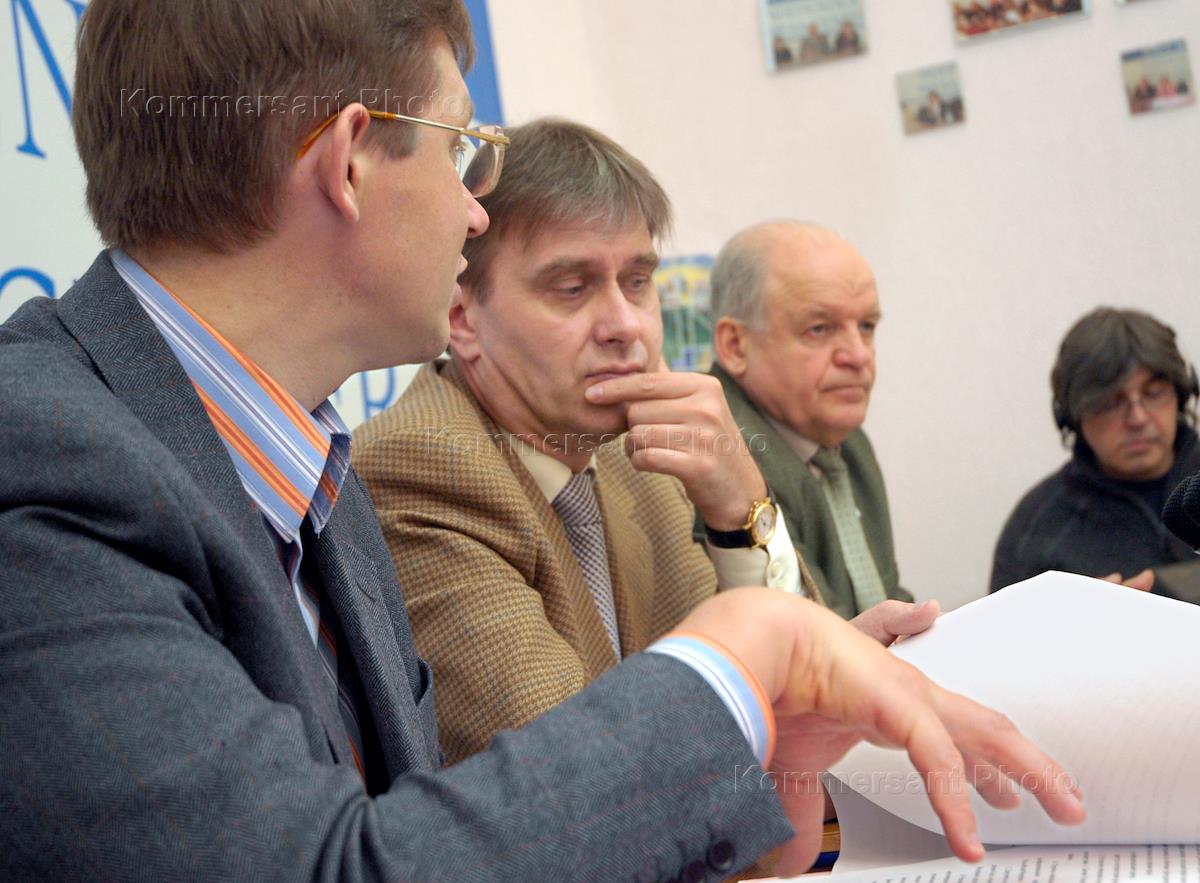 Russian State Duma lawmaker, member of the federation issues and regional policies committee Vladimir Ryzhkov (left) and Deputy of the State Duma of Russia Victor Cherepkov (the second to the right) take part in a press conference.