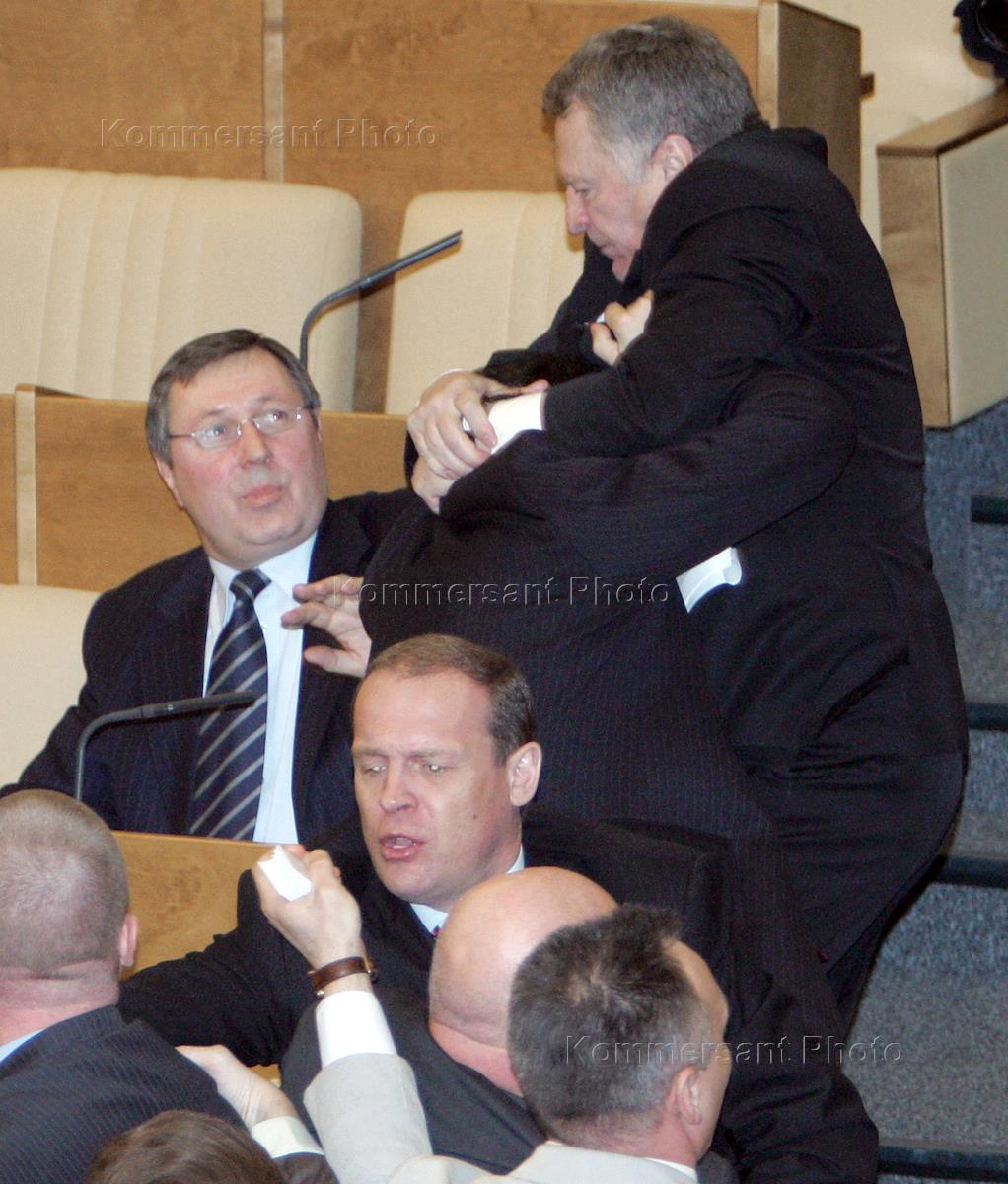 The State Duma Vice Chairman, leader of the Liberal Democratic Party (LDPR) Vladimir Zhirinovsky (left) fights the 'Rodina' faction Vice Coordinator, Vice Chairman of the State Duma Committee for the CIS affairs and communication with compatriots Andrey Savelyev during the State Duma session.