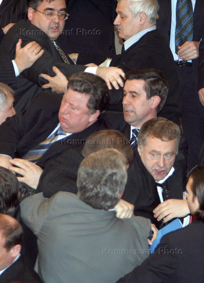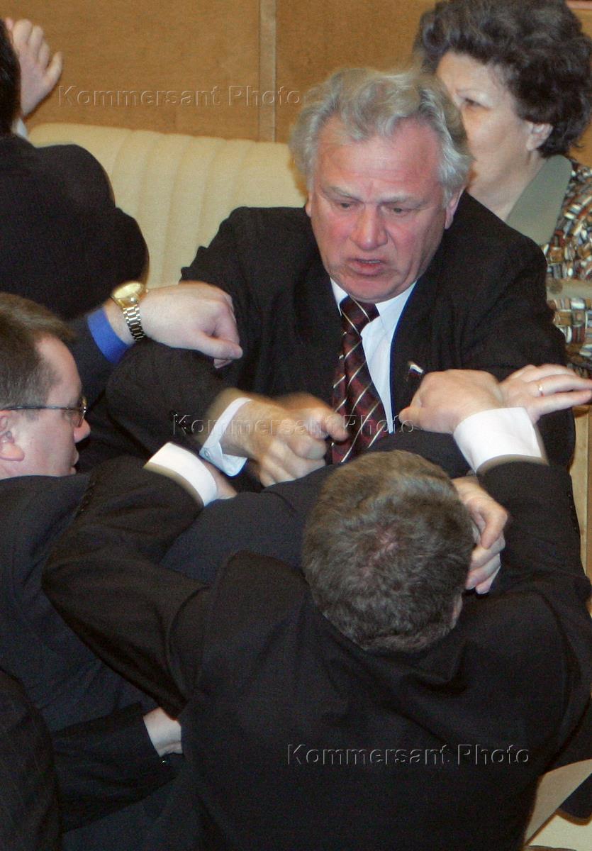 The State Duma Vice Chairman, leader of the Liberal Democratic Party (LDPR) Vladimir Zhirinovsky (left) fights the 'Rodina' faction Vice Coordinator, Vice Chairman of the State Duma Committee for the CIS affairs and communication with compatriots Andrey Savelyev during the State Duma session.