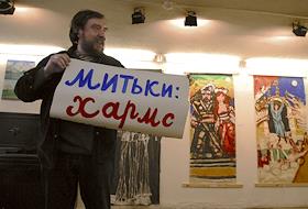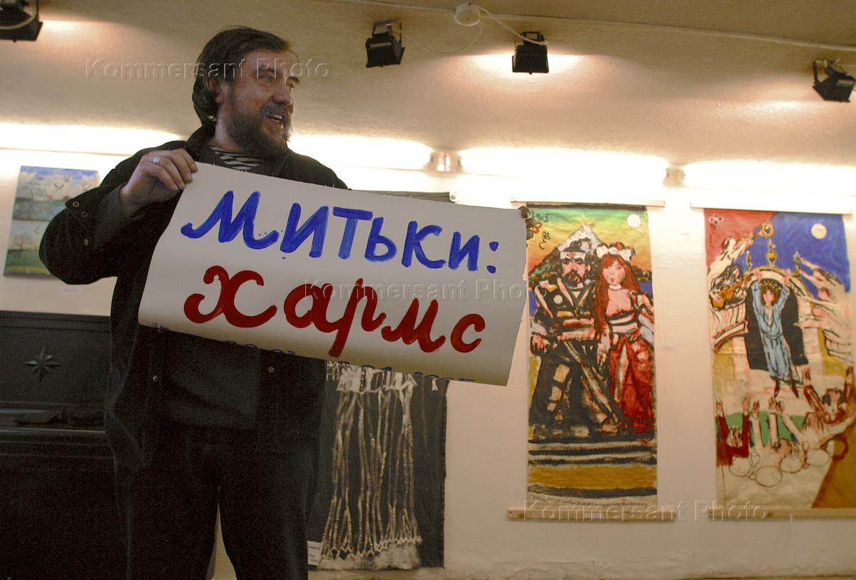 Художник творческого объединения "Митьки" Дмитрий Шагин на открытии выставки "Митьки:Хармс" в галерея "Борей".