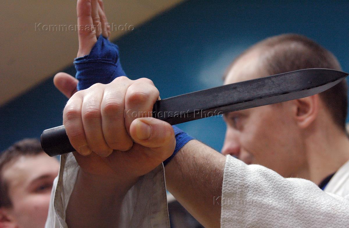 Sportsmen attend hand-to-hand fight trainig session in a sports club.