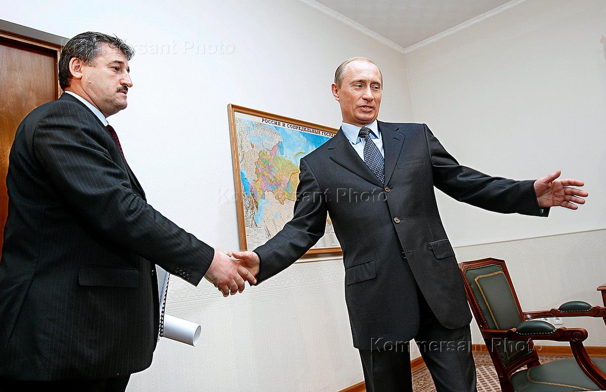 Президент России Владимир Путин (слева) и президент Чеченской республики Алу Алханов (справа) во время встречи в резиденции Президента России "Бочаров ручей".