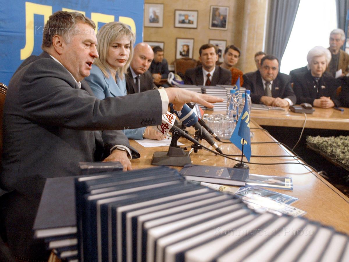 Заместитель председателя Государственной Думы России, лидер ЛДПР Владимир Жириновский (слева) на пресс-конференции, посвященной 15 - й годовщине образования Либерально-демократической партии. Пресс-конференция прошла в "АИФ-Новости".