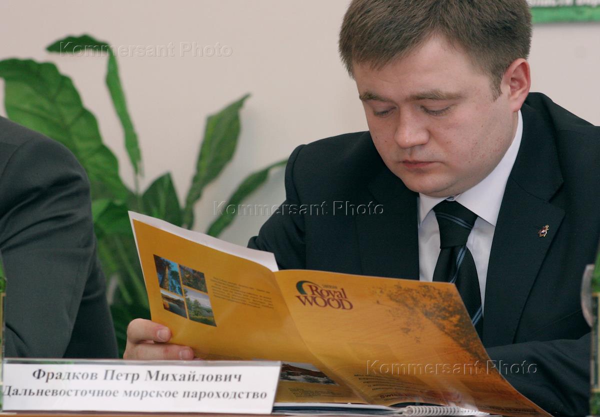 Petr Fradkov, the son of Russian Prime Minister Mikhail Fradkov, deputy managing director of the joint stock Far-Eastern Shipping Company takes part in a press conference.