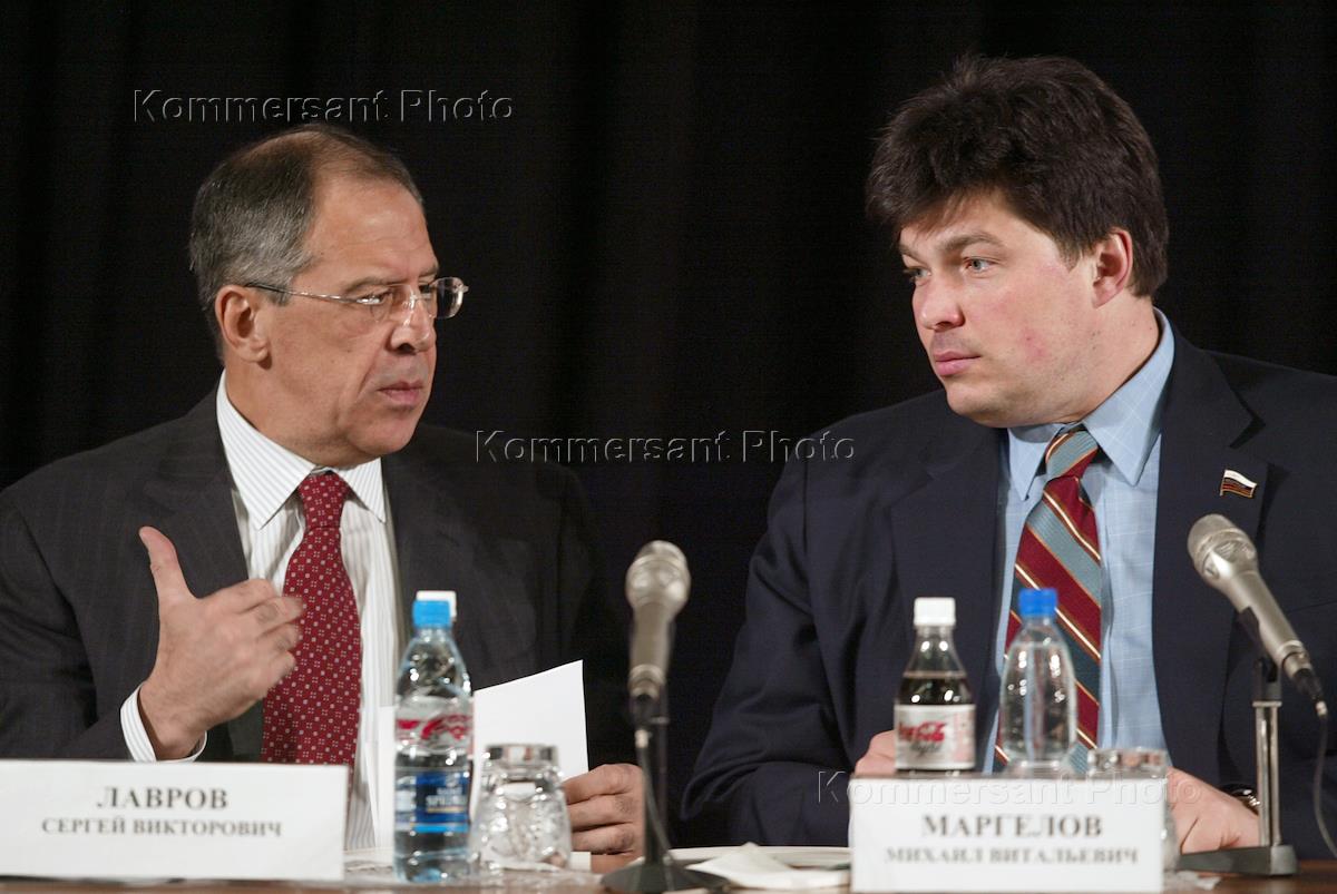 Foreign Minister Sergey Lavrov (left) and Pskovskaya region administration representative with the Federation Council, Chairman of the Federation Council Foreign Affairs Committee Mikhail Margelov (right) take part in a meeting at the Foreign Ministry.