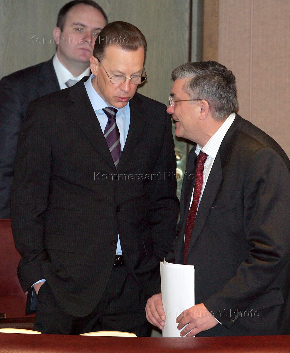 Председатель Комитета Государственной Думы России по экономической политике, предпринимательству и туризму Валерий Драганов (слева) и председатель комитета Государственной Думы России по делам СНГ и связям с соотечественниками Андрей Кокошин (справа) на очередном думском заседании.