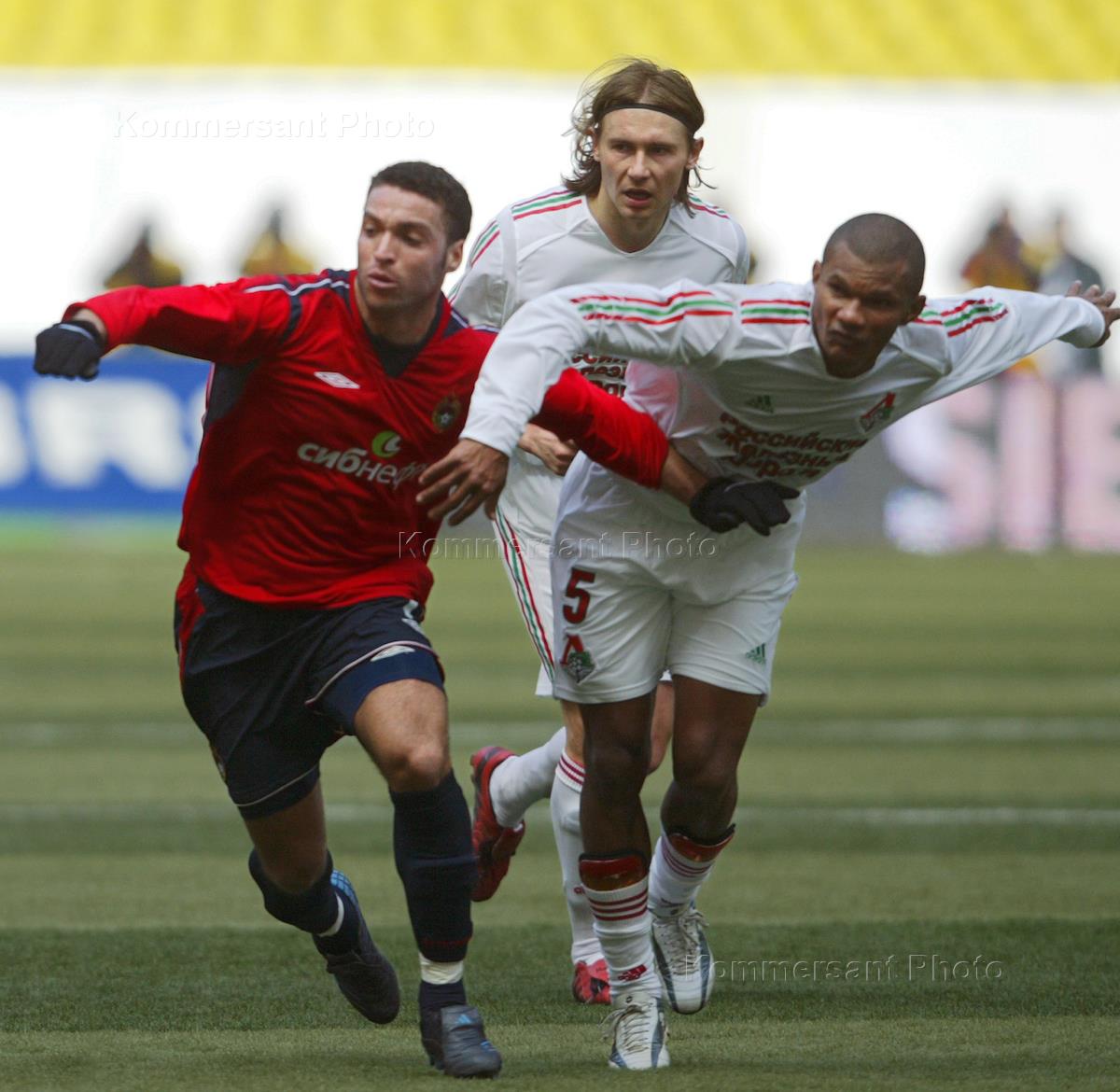 CSKA Moscow's Sergey Ignashevich (left), Elver Rahimic (centre) and Lokomotiv Moscow's Dmitry Sychev attend Russian Football Championship match between CSKA Moscow and Lokomotiv Moscow.