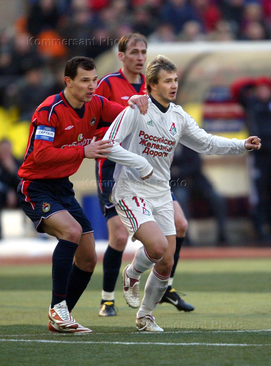 Lokomotiv Moscow's Dmitry Sychev (left) fights for a ball during Russian Football Championship match between CSKA Moscow and Lokomotiv Moscow.