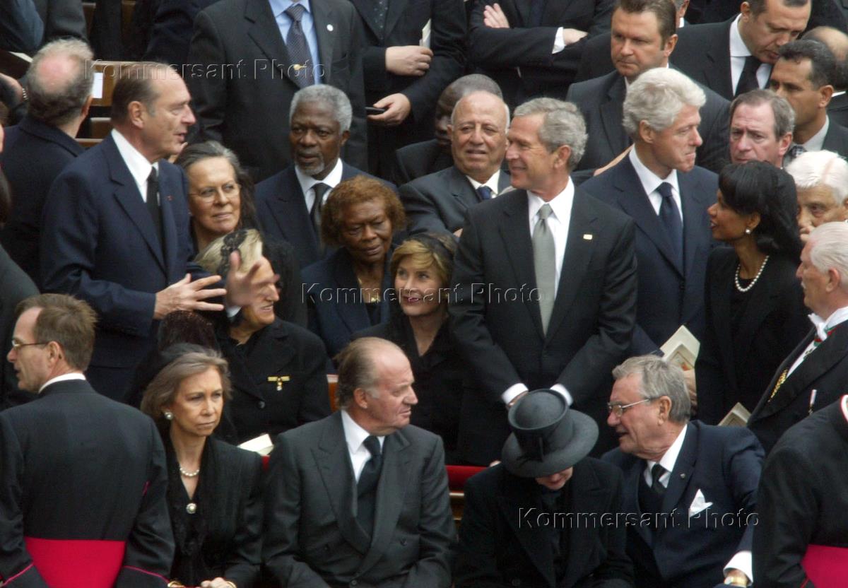 Президент Франции Жак Ширак (слева), президент США Джордж Буш (в центре) с супругой Лорой (сидит в центре),экс-президент США Билл Клинтон (пятый справа) и помощник президента США по национальной безопасности Кондолиза Райс (третья справа) на церемонии заупокойной мессы и обряда погребения Папы Иоанна Павла Второго. Папа Римский Иоанн Павел Второй скончался вечером 2 апреля.