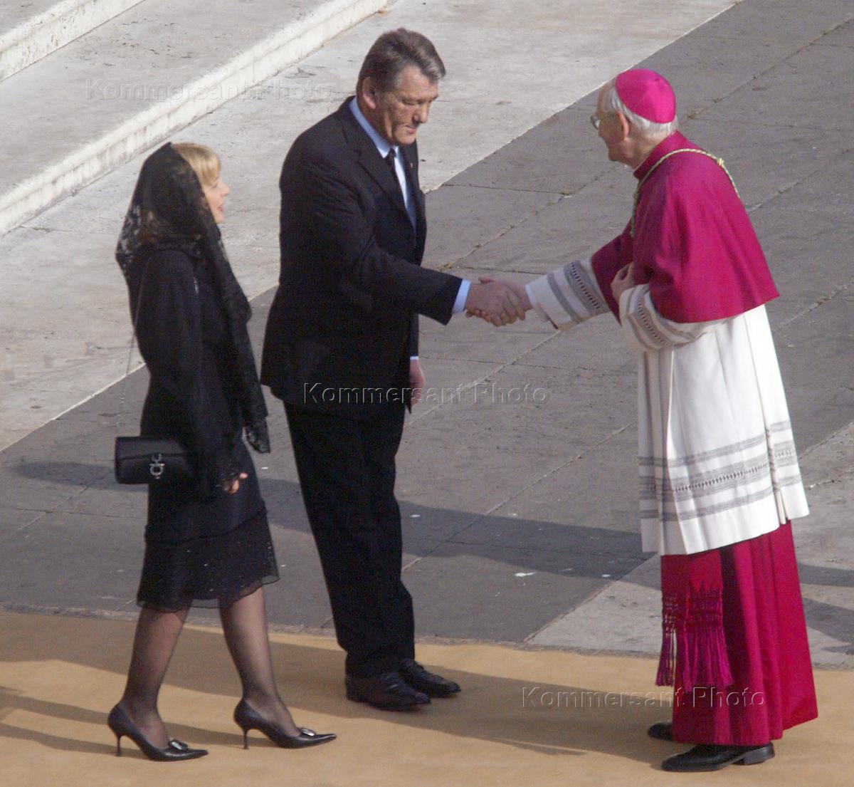 Президент Украины Виктор Ющенко (в центре) вместе с супругой на церемонии заупокойной мессы и обряда погребения Папы Иоанна Павла Второго. Папа Римский Иоанн Павел Второй скончался вечером 2 апреля.