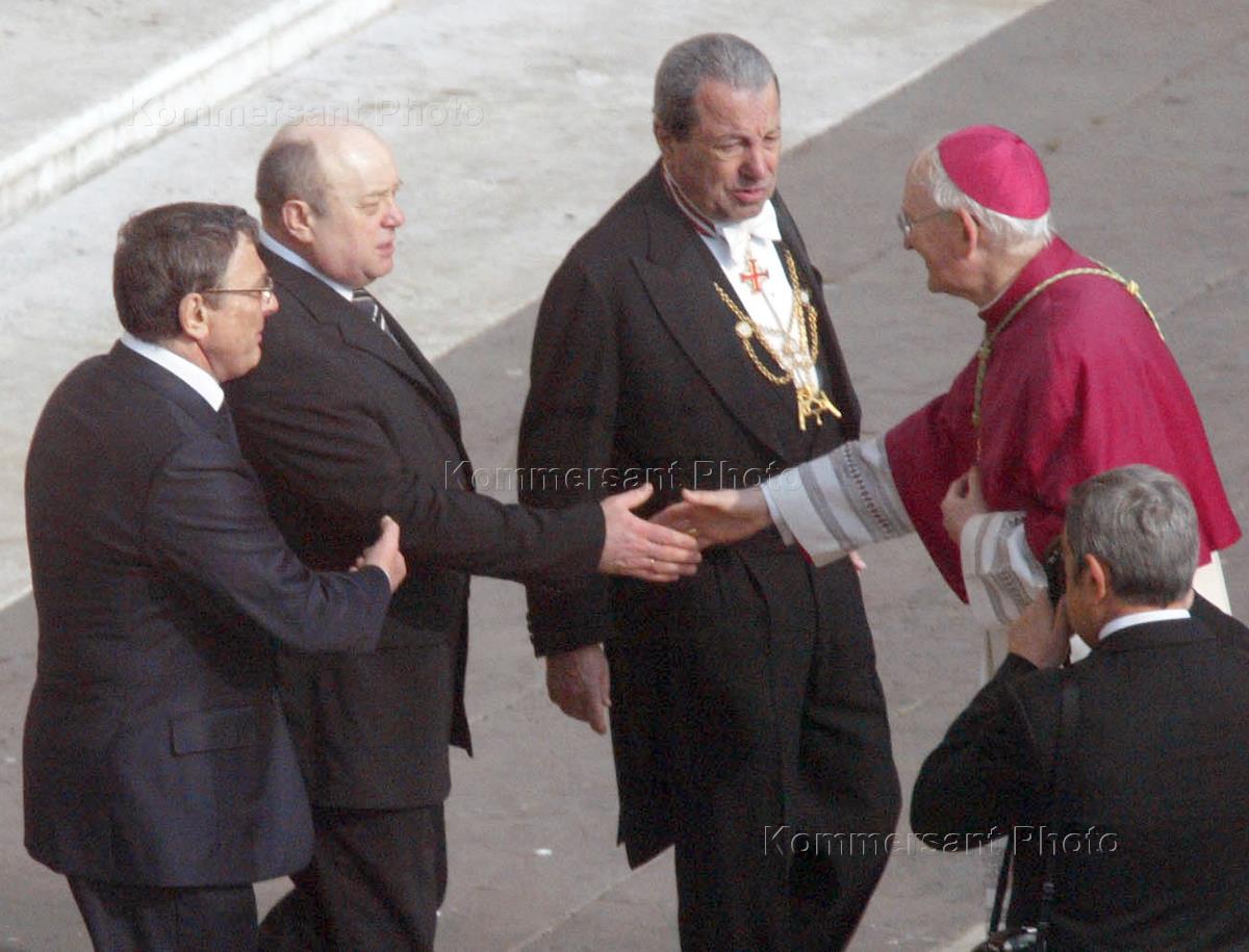 Председатель Правительства России Михаил Фрадков (в центре) на церемонии заупокойной мессы и обряда погребения Папы Иоанна Павла Второго на площади у собора Святого Петра. Папа Римский Иоанн Павел Второй скончался вечером 2 апреля