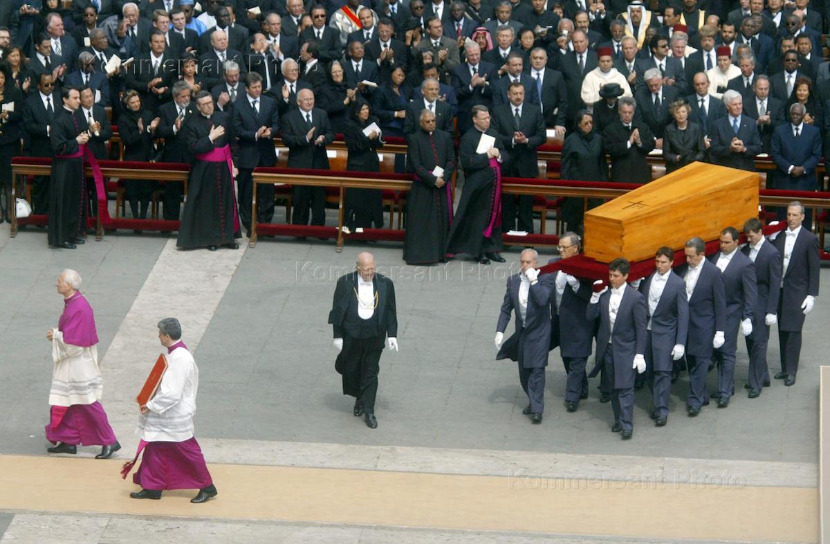 Церемония заупокойной мессы и обряда погребения Папы Иоанна Павла Второго. Папа Римский Иоанн Павел Второй скончался вечером 2 апреля.