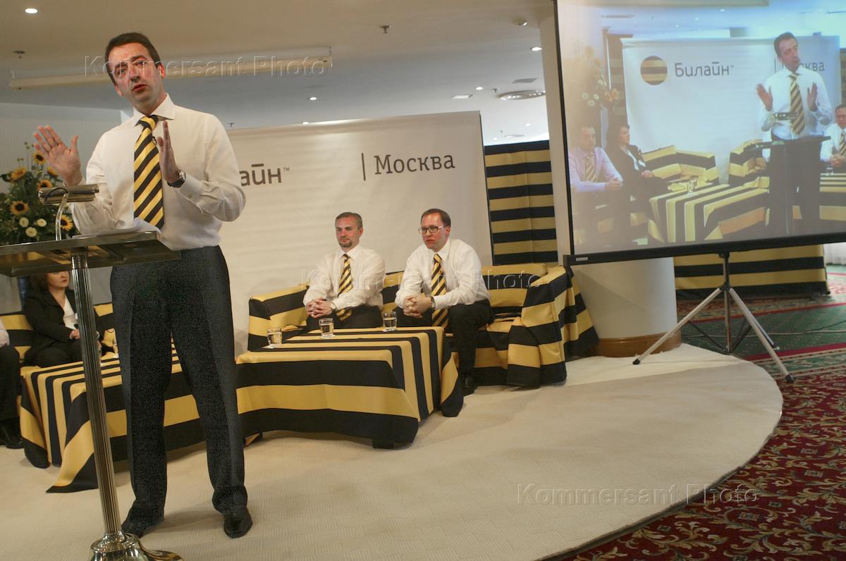 Director general of the Russia's second-largest mobile phone operator VimpelCom Alexander Izosimov takes part in a press conference. VimpelCom has launched a campaign to re-style its major brand name, changing it from BeeLine GSM to BeeLine. The company also introduced a new circular logo featuring horizontal black and yellow stripes.