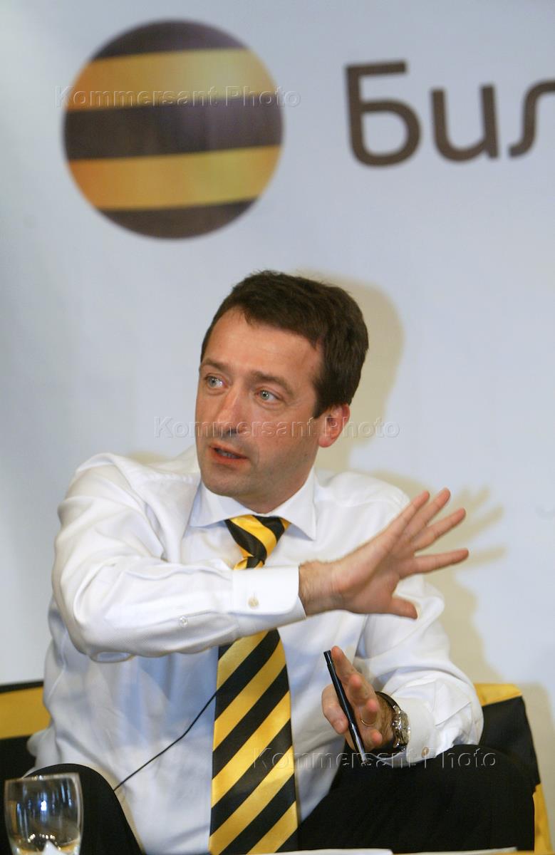 Director general of the Russia's second-largest mobile phone operator VimpelCom Alexander Izosimov takes part in a press conference. VimpelCom has launched a campaign to re-style its major brand name, changing it from BeeLine GSM to BeeLine. The company also introduced a new circular logo featuring horizontal black and yellow stripes.