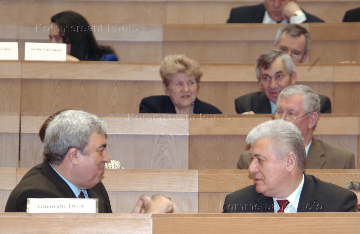 Выборы президента Молдавии. Президент Академии наук Молдавии Георгий Дука (слева) и президент республики Молдова Владимир Воронин (второй слева) во время объявления результатов голосования. Парламент Молдавии переизбрал президентом Владимира Воронина.